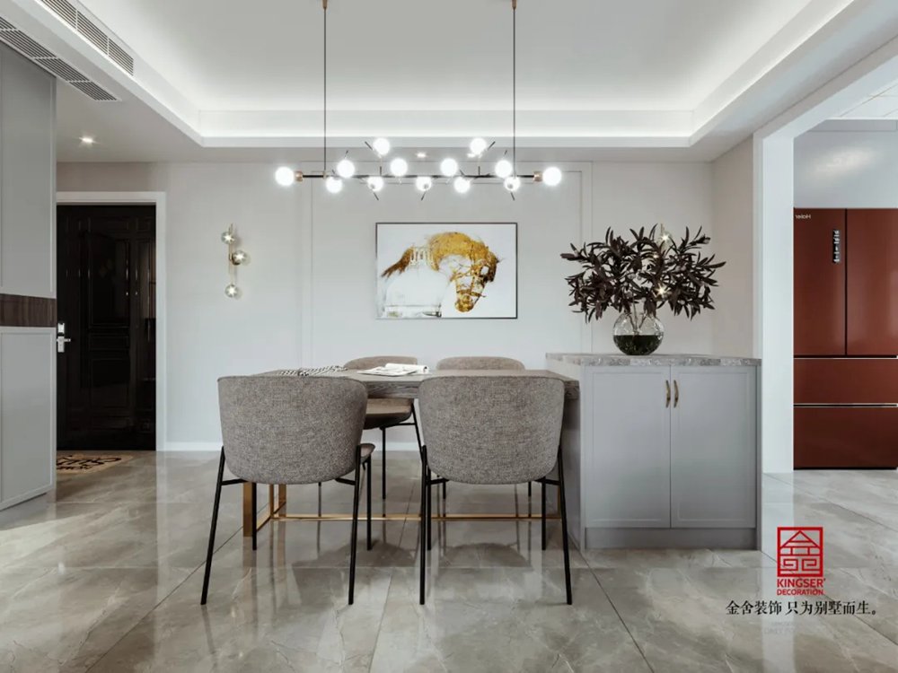 干凈明亮的餐廳空間借由藝術(shù)特質(zhì),有著一氣呵成的輕奢氣派,石材、布藝及金屬等多樣的材質(zhì)運(yùn)用使得空間靈動(dòng)而不失活潑。