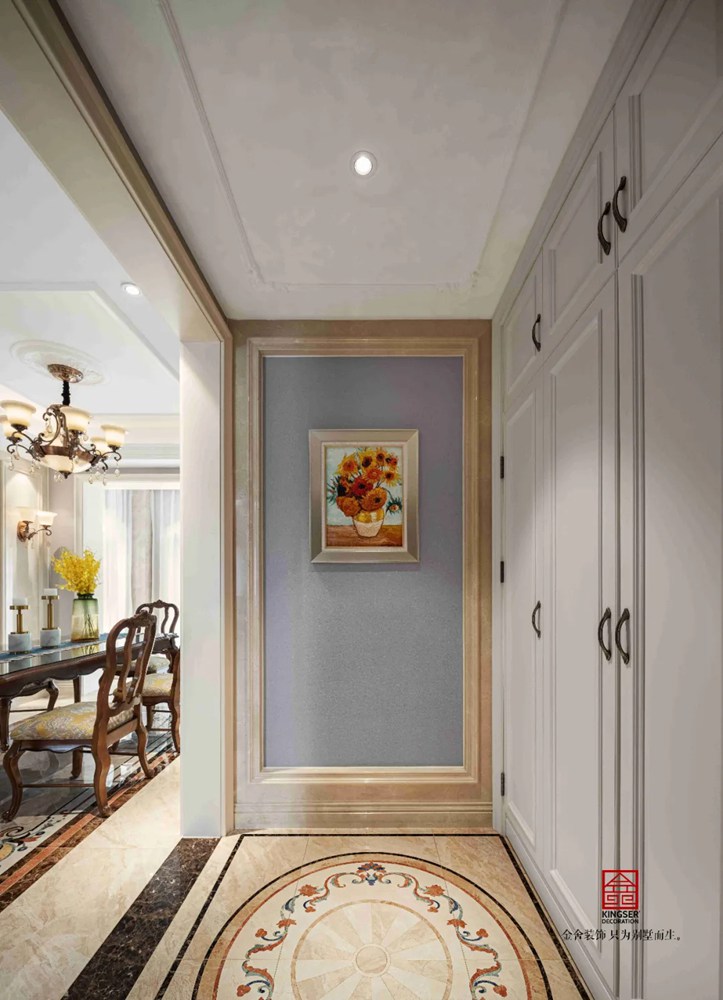 門廳位置透過設(shè)計(jì)師的設(shè)計(jì)來凸顯歐式的純?nèi)伙L(fēng)情及深厚的文化底蘊(yùn),走廊間色調(diào)柔和,給人高貴舒適的感受,地面拼花為簡潔的地板起點(diǎn)綴作用,梵高的向日葵掛畫彰顯業(yè)主品位。