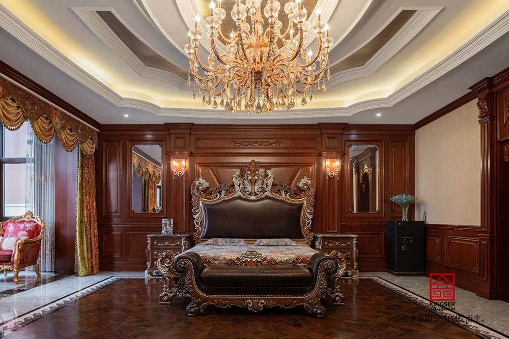 一樓東廳男女主人居住,色彩整體色調為秋香色、琥珀棕,從而體現了富麗堂皇,高柜清新的整體環境。
