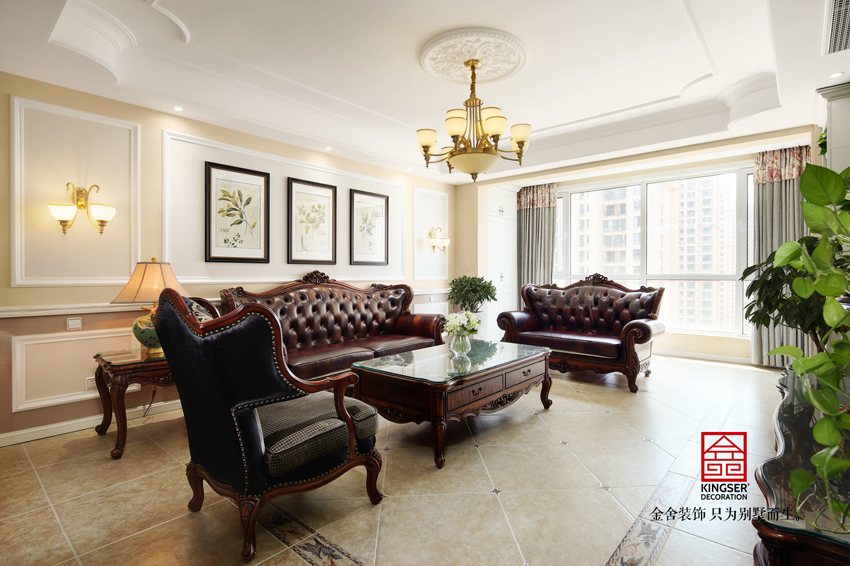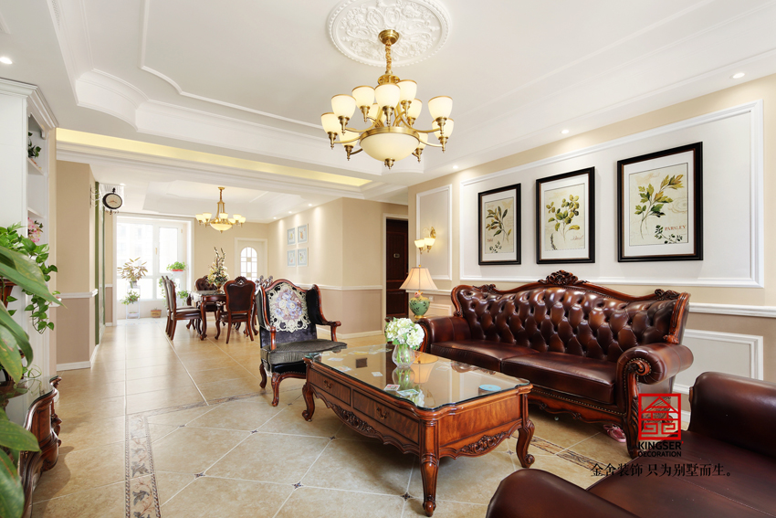 石家莊別墅裝修設(shè)計的客廳的布置頗有一種美式風(fēng)格的典型特征,厚重感十足的沙發(fā)搭配墻面淺色的畫作,嚴(yán)肅又帶有幾分輕松的感覺??蛷d中綠色的盆栽給空間增加了幾分活力,墻面的造型搭配淡雅的燈光,靈巧純潔,恬靜活潑,柔和中流露出激情。