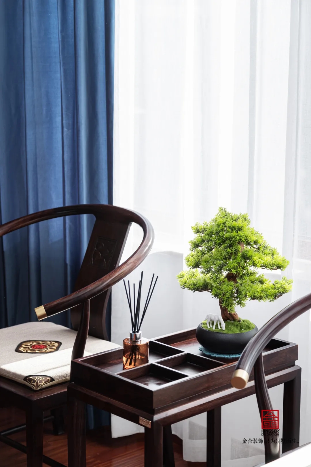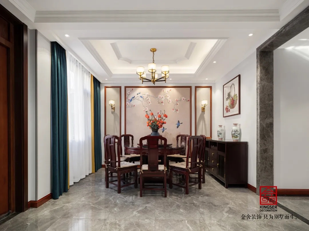 餐廳的圓形餐桌與方形吊頂相呼應,完美的嵌入了“方圓之間”的東方生活美學。既保留了原有頂面的高度又合理的劃分了空間,讓空間看起來更寬敞。餐廳背景墻的工筆花鳥更是提高了整個空間的靈動感,似在平淡的生活增加一份閑趣,讓家人在一飲一品之間感受生活的幸福。