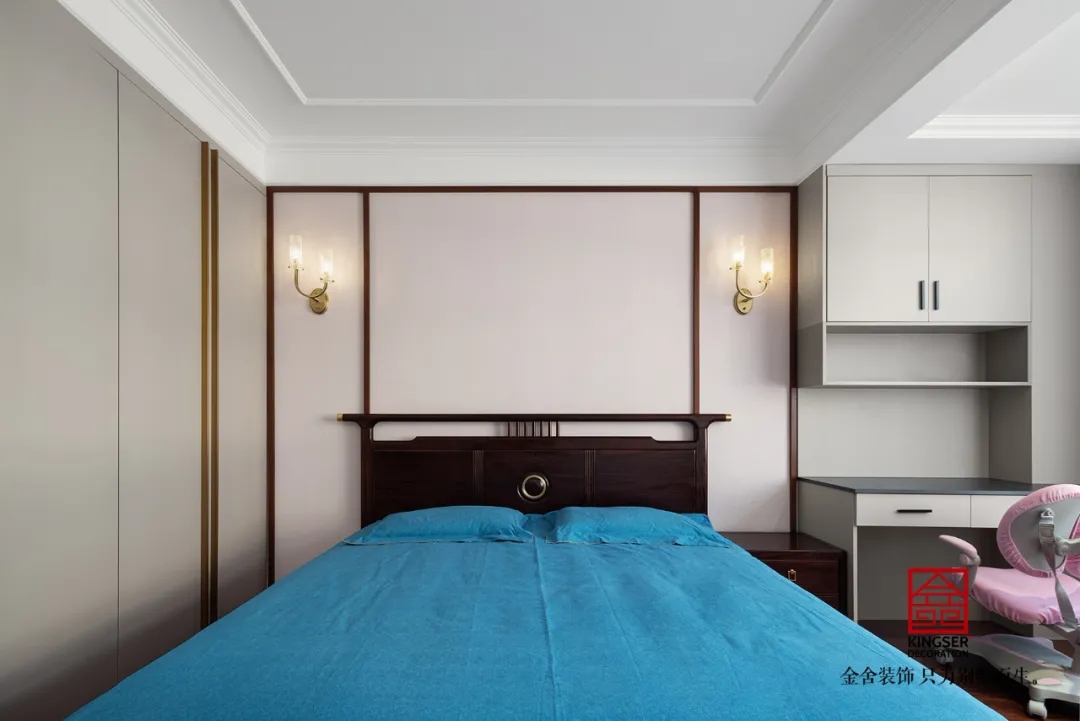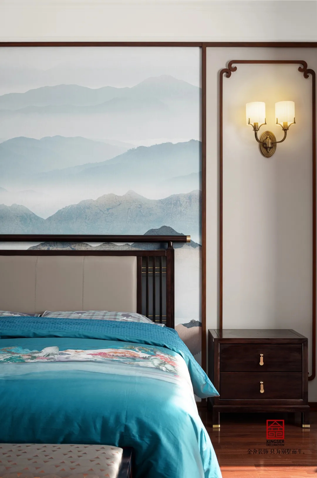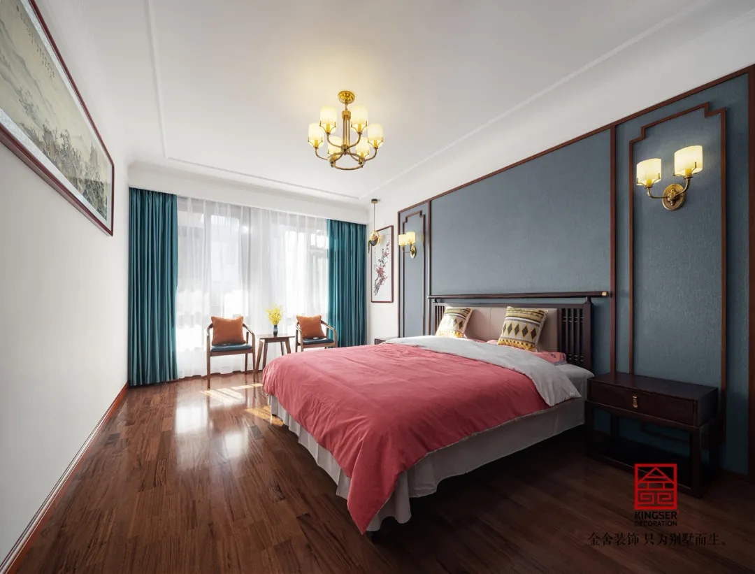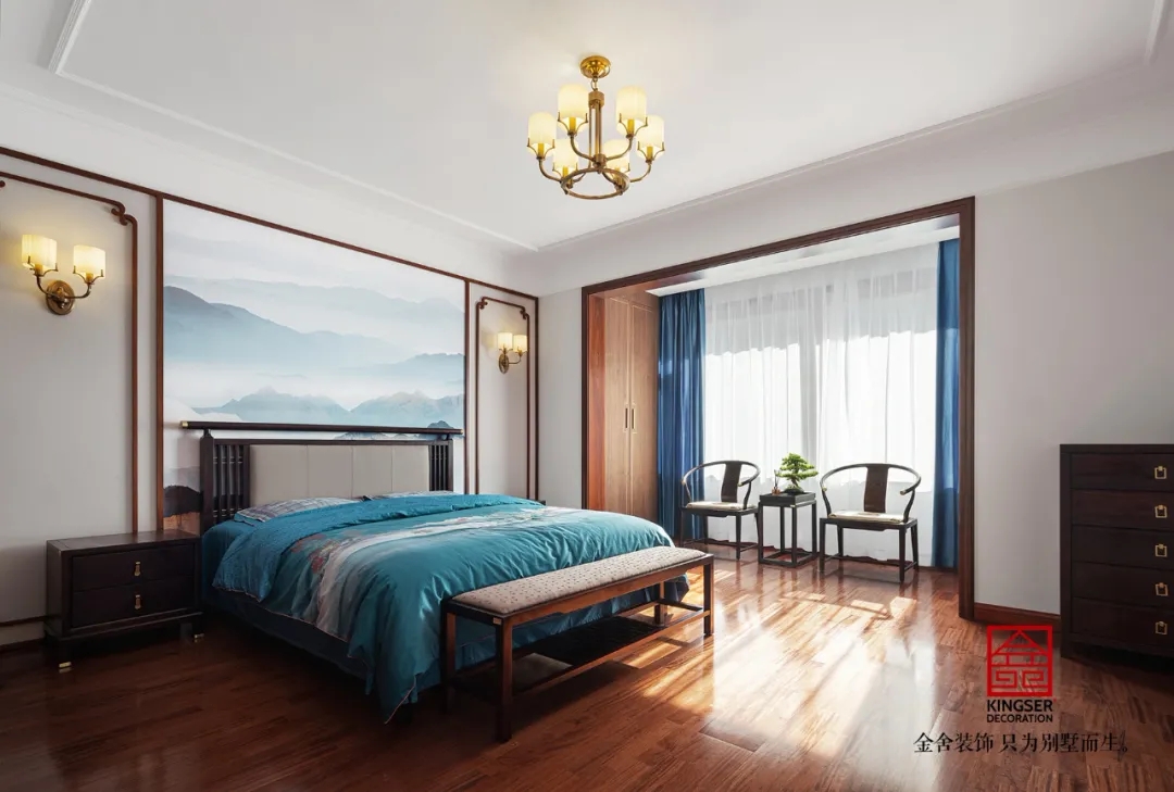 臥室空間看起來并沒有過多的浮夸裝飾,可設計師合理的配置與點綴,卻更好的完成了新中式別墅的古典與時尚交匯。