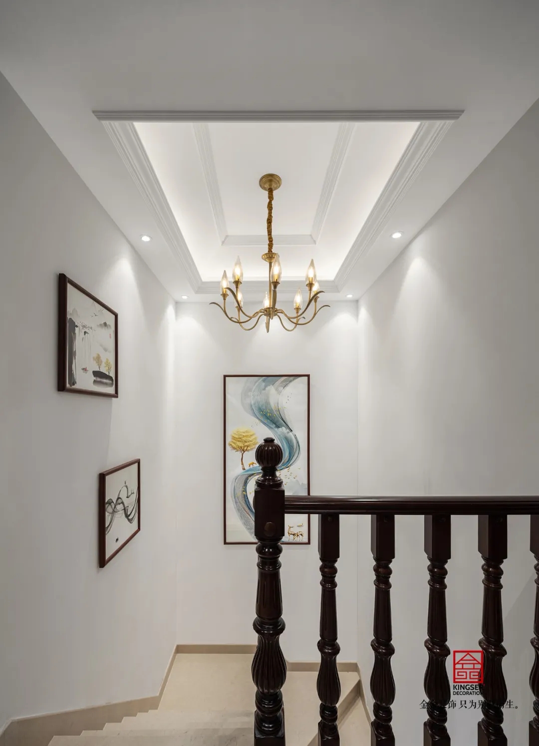 深木色的扶梯把手跟墻面的潔白無暇形成非常鮮明的對比,現代風格繪畫加上古銅色的吊燈打破了樓梯間的單調,突出了一種獨有的藝術氣息。