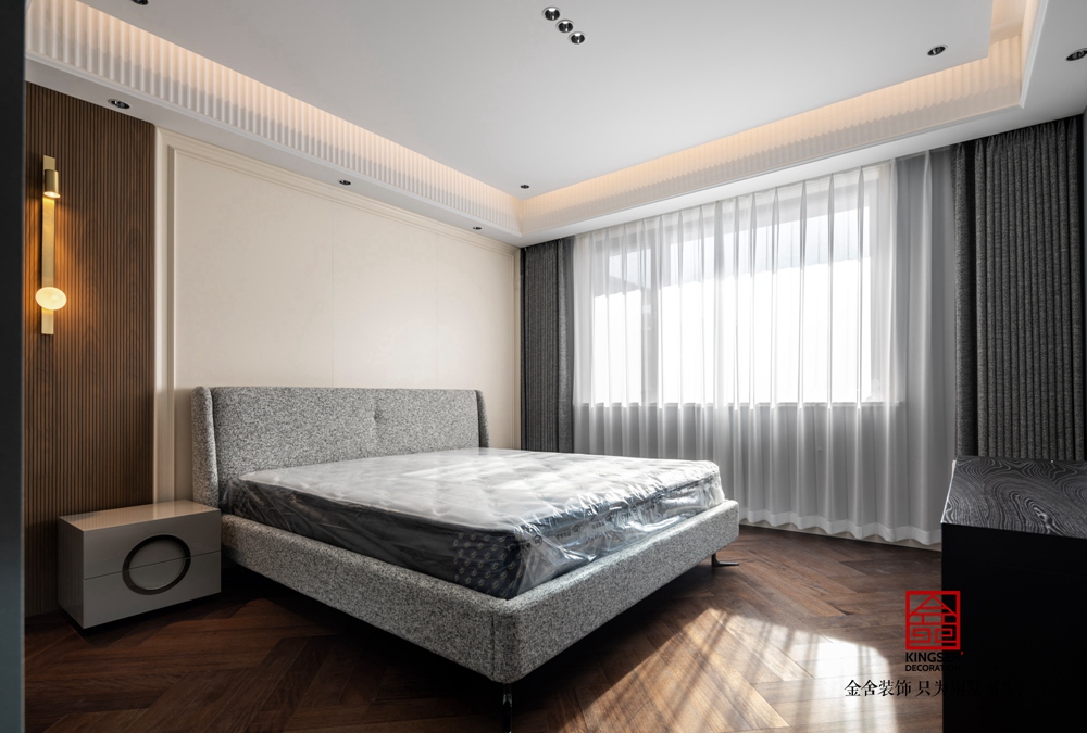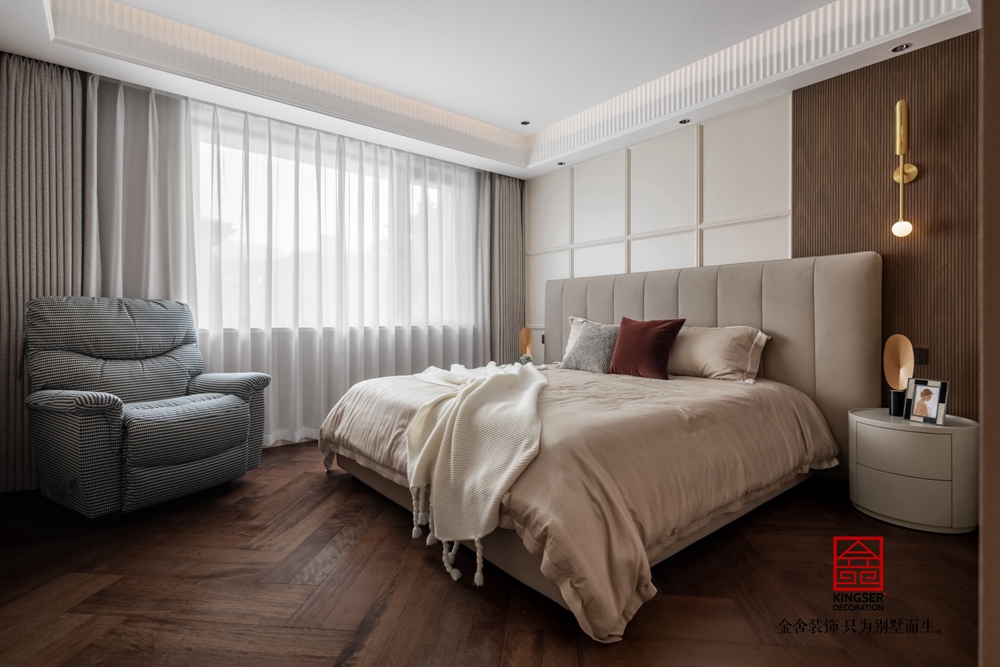 三層的空間就屬于完全的靜區(qū)了,除了一個(gè)三合一套間式的主臥之外還有一個(gè)書房。主臥完全采用深棕色木地板,吻戲而舒適,玻璃磚的設(shè)計(jì)保證了走廊的采光,將近四十平的臥室也給人一種氣派而美觀的感覺(jué)。