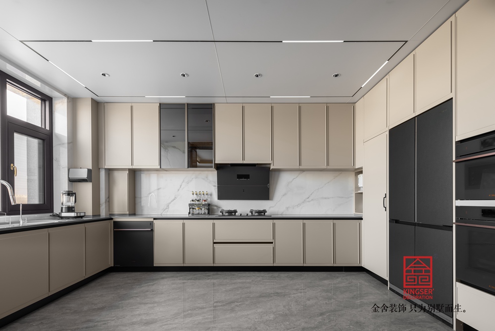 圓形吊頂就好像是映刻在天空的餐桌,團圓的意味在此時濃烈了起來,黑色的石材,黑色的玻璃門,將沉穩(wěn)質(zhì)感拉滿。家人圍坐,餐盤碰撞聲、談笑聲繞著這方天地打轉(zhuǎn),團圓不再是抽象的詞,成了觸手可及的暖。