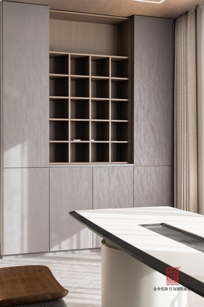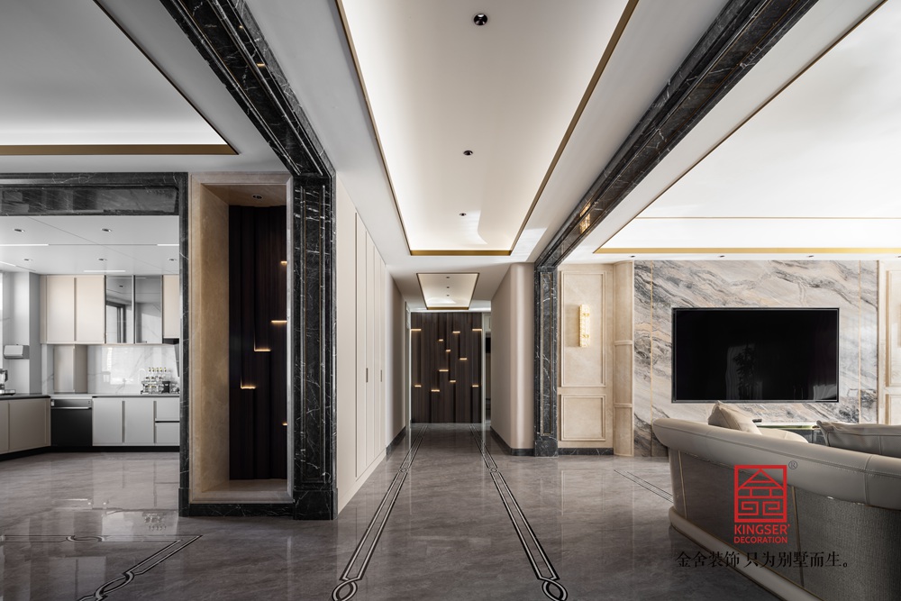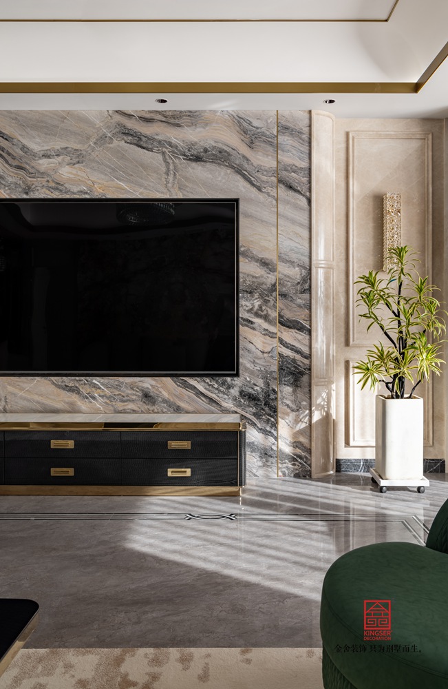 如滔滔江水傾瀉而下的石材肌理,赭石與黑色的顏色對撞,石材的堅硬與皮制的溫潤的融合,金屬的邊緣與整體溫暖的配色,這是客戶對生活的向往,也是對美好未來的構(gòu)建。