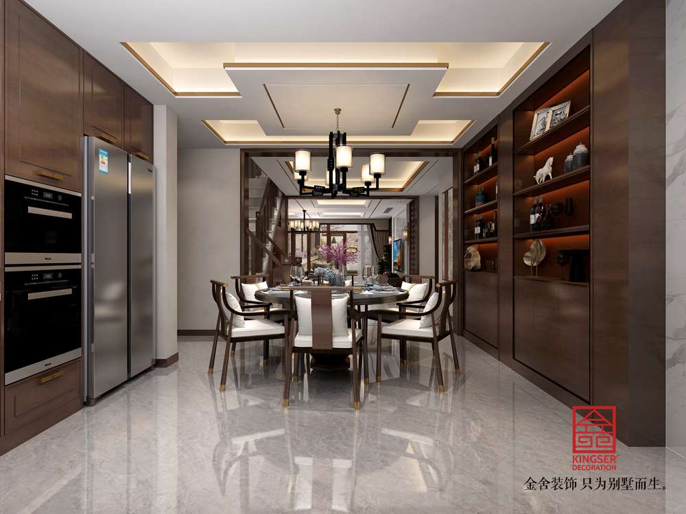 設計師對于品質的呈現(xiàn)有著極致的追逐。精致的餐椅主要以木色為主調,表明了悠悠山水主題,高低起伏的吊燈,整體營造出視覺上的美感。