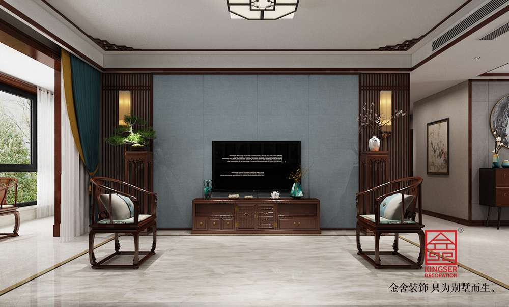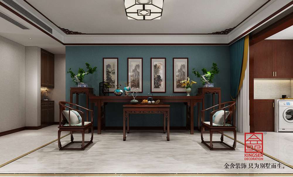 石家莊金舍裝飾-融創(chuàng)中心217平米中式風格裝修效果圖。以深色為主,有深厚沉穩(wěn)的底蘊。裝飾造型主要采用硬朗簡潔的直線條,空間具有層次感。既使得中式家具古典、質(zhì)樸的內(nèi)涵顯現(xiàn),又符合現(xiàn)代人追求的時尚感、實用性。