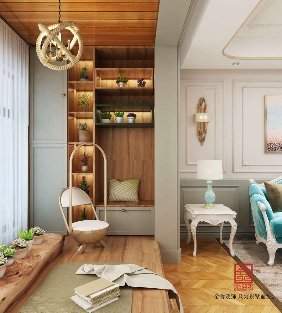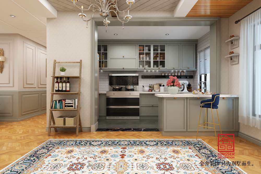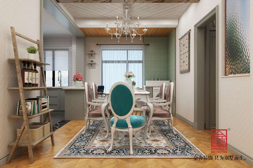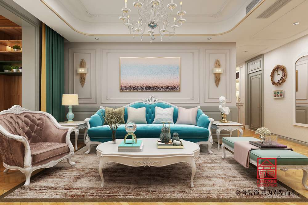 設(shè)計(jì)說(shuō)明:此案例為石家莊金舍裝飾-東南智匯城126平米法式輕奢風(fēng)格裝修效果圖。藍(lán)色系具有立體感的沙發(fā)顏色,使墻面很顯層次感;多彩的地毯、靈動(dòng)設(shè)計(jì)的臺(tái)燈、不拘一格的掛畫(huà),營(yíng)造出一幅自由、溫馨、浪漫的氛圍;而客廳旁的落地窗給足了這間空間明亮的自然采光,用餐區(qū)域餐桌上方的水晶吊燈與客廳中的精致吊燈遙相呼應(yīng),讓整個(gè)空間之中都映射出一種浪漫氛圍,法式風(fēng)格如同法國(guó)這個(gè)國(guó)家一樣,浪漫迷人,仿佛普羅旺斯的陽(yáng)光,灑滿你的家。藍(lán)色調(diào)營(yíng)造浪漫時(shí)尚法式風(fēng)情,尋求心靈的自然回歸感;將法式傳統(tǒng)的三顏色與當(dāng)季流行色融合,不失法式的貴氣和浪漫