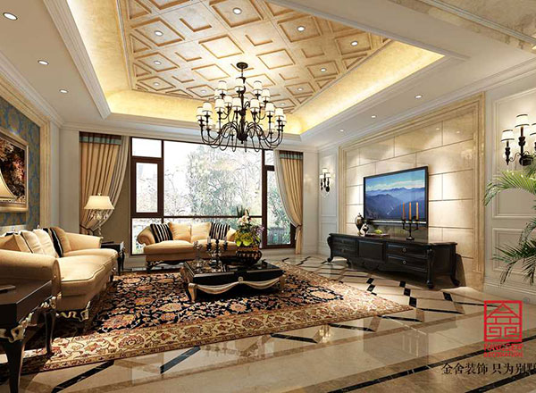 石家莊金舍裝飾-萬(wàn)科東麗湖300平米歐式風(fēng)格裝修效果圖。電視背景墻采用大理石使整個(gè)空間在視覺(jué)上更加高貴、典雅,背景墻旁搭配復(fù)古形狀的臺(tái)燈,盡顯雅致,茶幾上擺放復(fù)古的燈架和花束作為裝飾,讓空間更為清新自然,石膏吊頂,搭配精致的水晶吊燈、復(fù)古的壁畫(huà),營(yíng)造出一種懷舊、浪漫的感覺(jué),仔細(xì)觀察,即使是一個(gè)小地方,一件擺件的挑選,起承轉(zhuǎn)合間,空間里有了色彩注入,有了細(xì)節(jié)規(guī)劃,讓家氛圍豐富而現(xiàn)代。