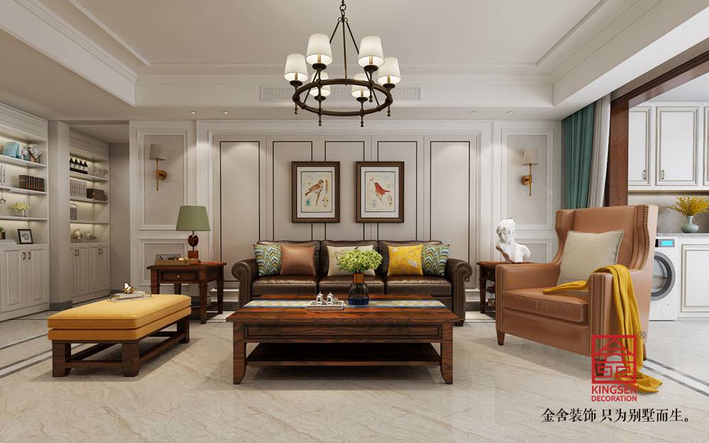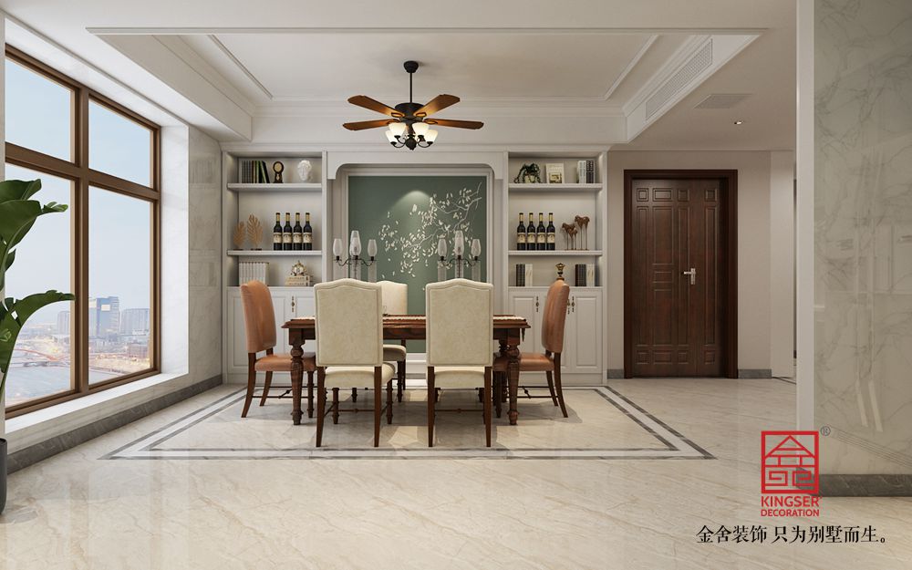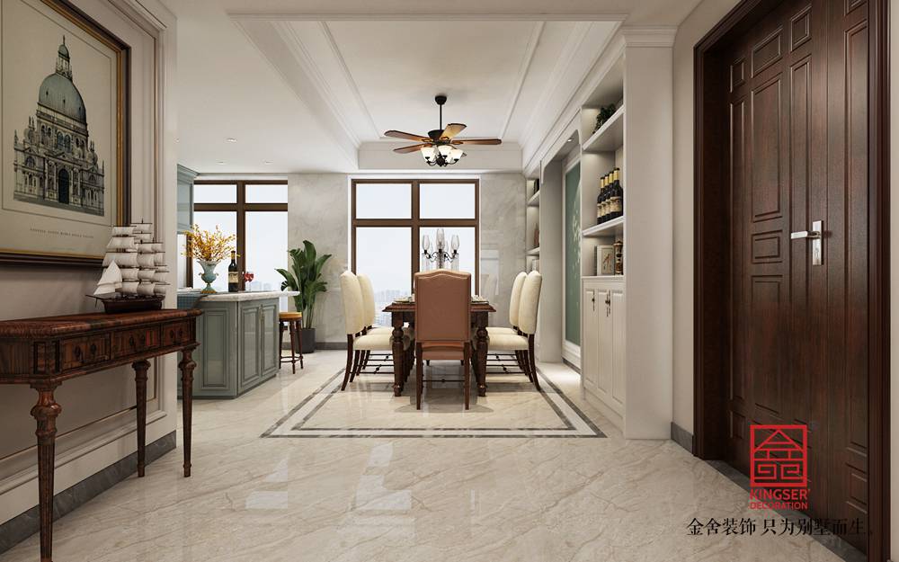 設計說明:此案例為石家莊金舍裝飾-融創中心217平米簡美風格裝修效果圖。簡美風格即是簡約美式風格,客廳裝飾韻味既含有古典美式的華貴又有現代風格的簡約,運用清亮的色彩,從硬裝到軟裝追求空間的干凈與利落,不做復雜的空間布局,讓室內充滿溫馨和舒適的感覺,帶給人休閑式的浪漫生活,餐廳基本上都與廚房相連,廚房的面積較大,操作方便、功能強大,廚房的多功能還體現在家庭內部的人際交流多在這里進行,這兩個區域會同起居室連成一個大區域,成為家庭生活的重心。