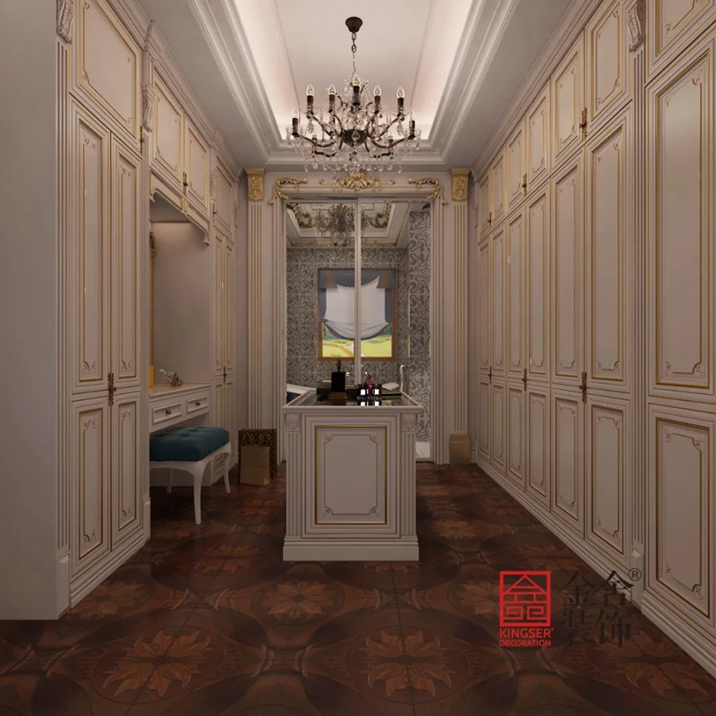 奢華紋理的衣柜配上特殊紋理的亞光木地板。造型別致的吊燈,在夜晚亮起時仿佛是天空中的星星,璀璨而浪漫。
