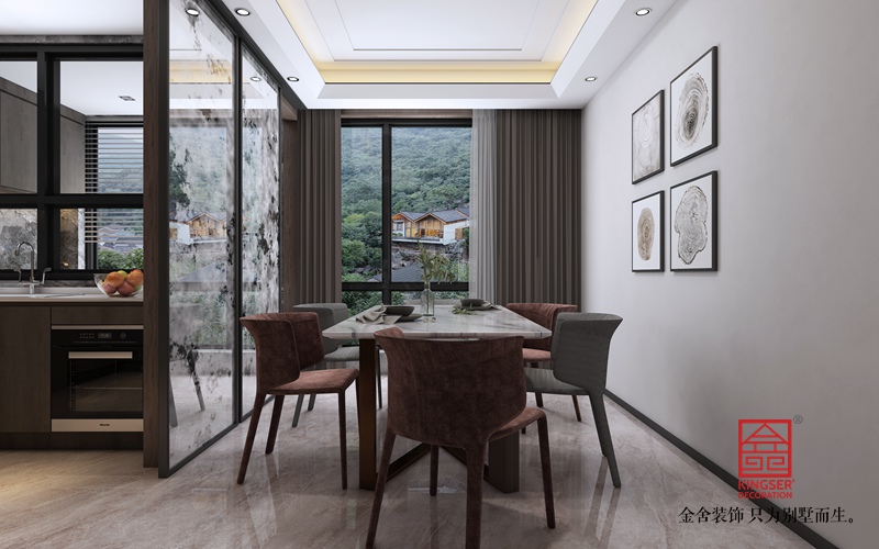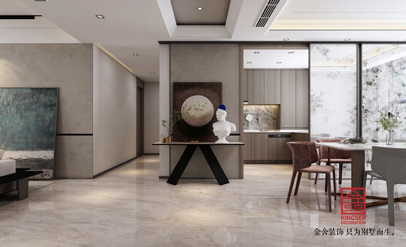 客餐廳南北通透、陽光穿堂而過。進門玄關處石膏板凹凸造型搭配上藝術漆以金屬邊線做分界線裝飾分割更顯靈動。右邊緊接餐廳廚房,以玻璃門分割廚房和餐廳拉開門及是半開放式廚房。使餐廚空間更加靈動通透。