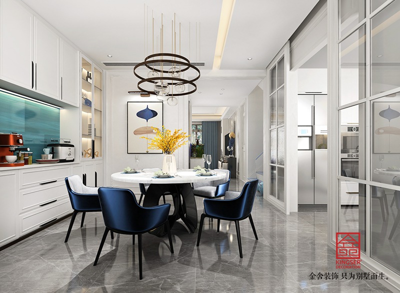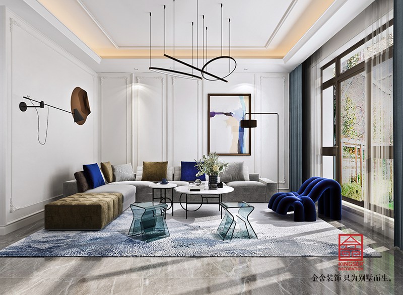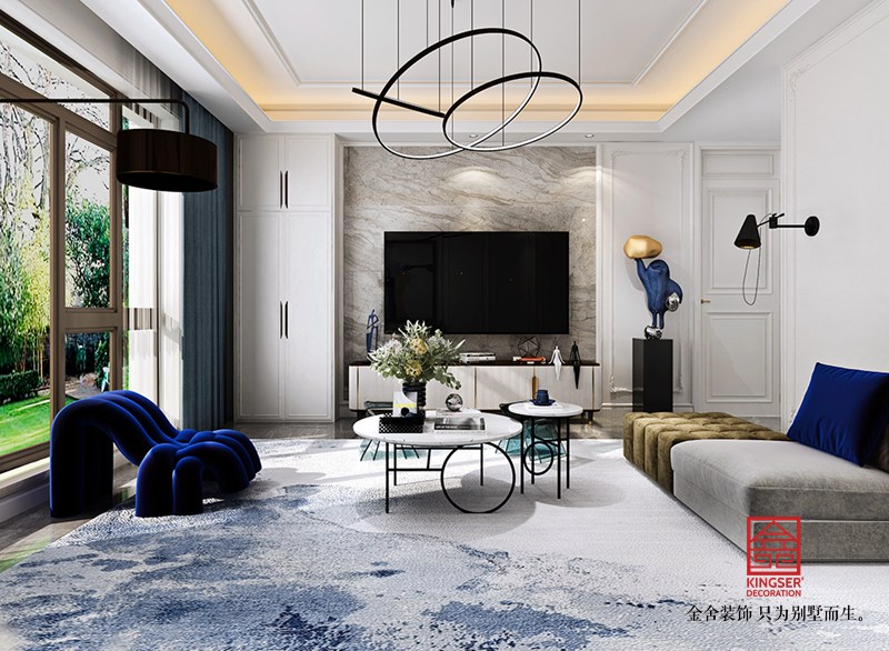 此案例為石家莊金舍裝飾-大者別墅200平米現(xiàn)代法式裝修效果圖。半個世紀前,在意大利米蘭的畫展上,克萊因的藍色首次亮相,八幅同樣大小、布滿天鵝絨質(zhì)感的藍色畫布讓人驚喜。我們從藝術(shù)展中獲取靈感,運用到室內(nèi)設(shè)計中,試圖營造一種極具藝術(shù)感的現(xiàn)代空間。