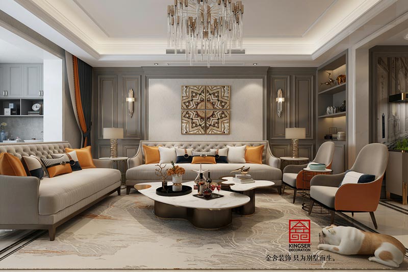 石家莊金舍裝飾-東南智匯城191平米美式輕奢風(fēng)格裝修案例。設(shè)計(jì)以美式輕奢風(fēng)格為基調(diào)。輕奢主義和現(xiàn)代美式的碰撞,成就了溫馨格調(diào)與設(shè)計(jì)質(zhì)感的完美融合。