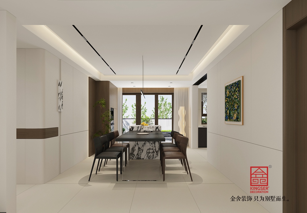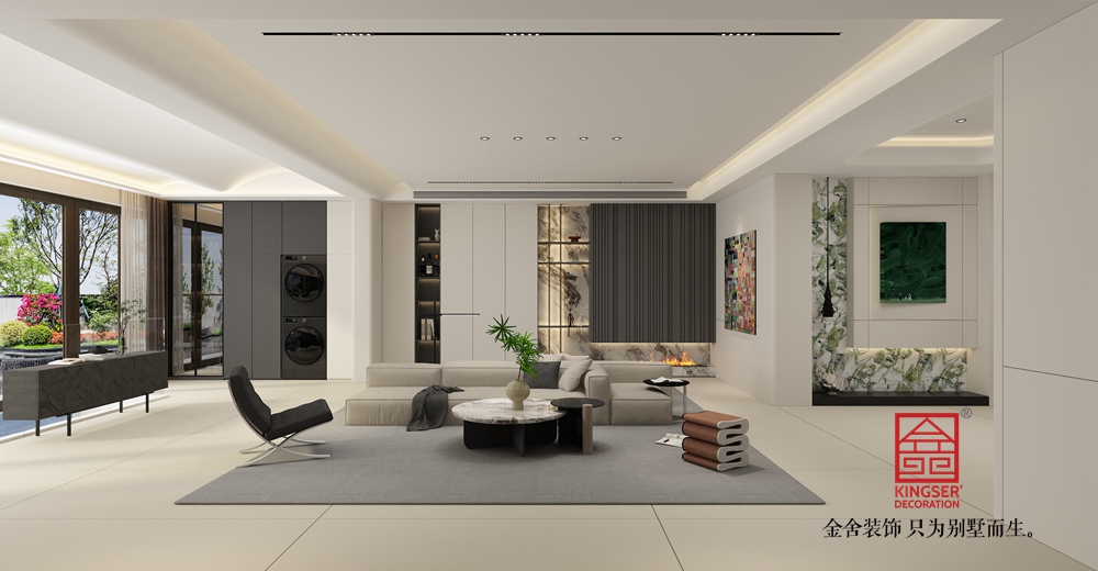 裝飾上,左側(cè)色彩絢麗的藝術(shù)畫作,為空間注入藝術(shù)活力;綠植與特色擺件的點(diǎn)綴,讓空間更顯生機(jī)與個(gè)性。充足的自然采光透過大窗涌入,結(jié)合精心設(shè)計(jì)的室內(nèi)照明,使空間明亮通透。整體設(shè)計(jì)簡約卻不失格調(diào),每一處細(xì)節(jié)都彰顯出對高品質(zhì)別墅生活的用心營造。