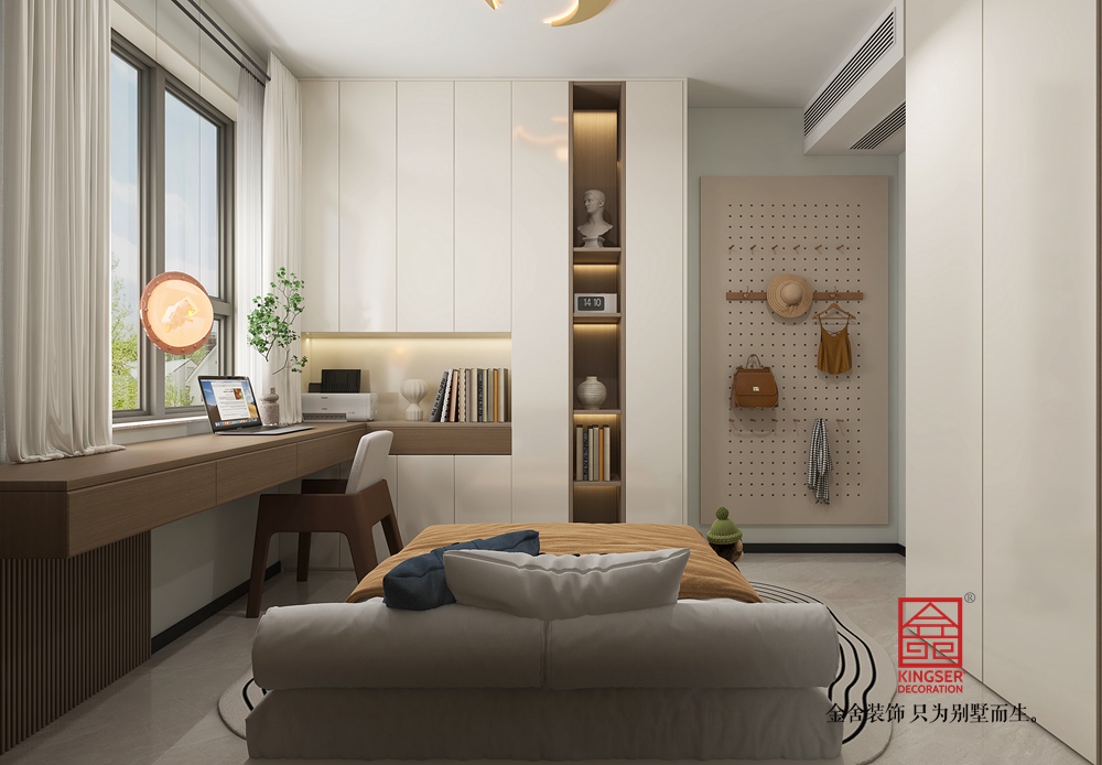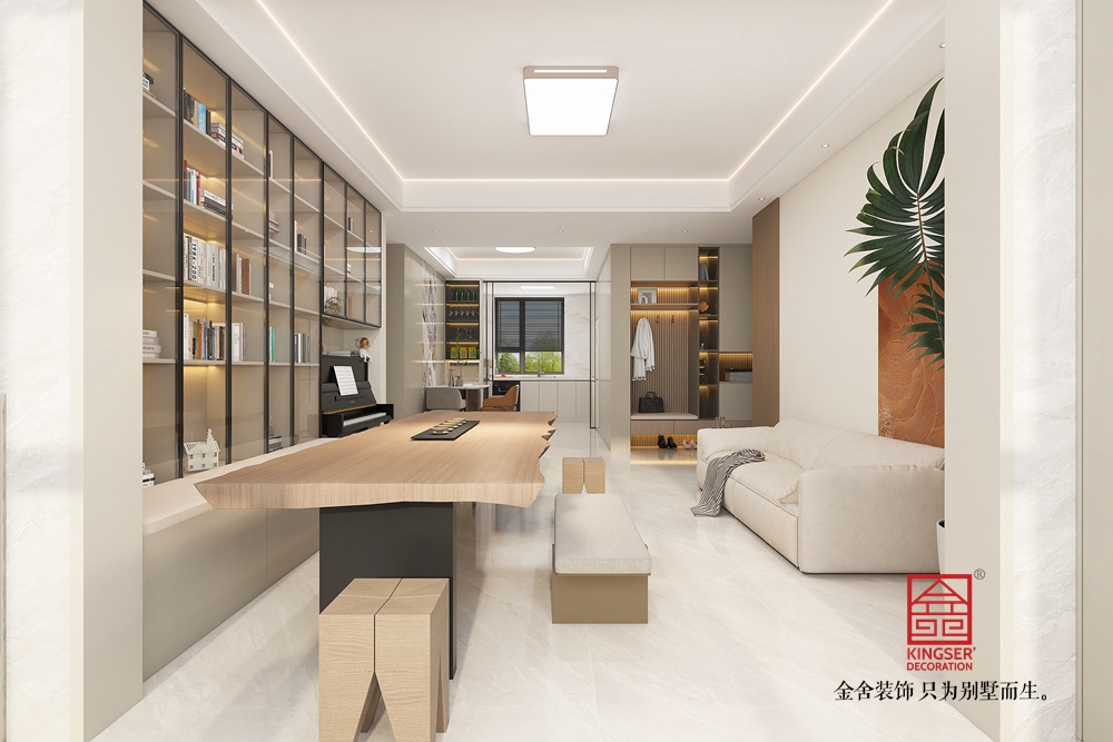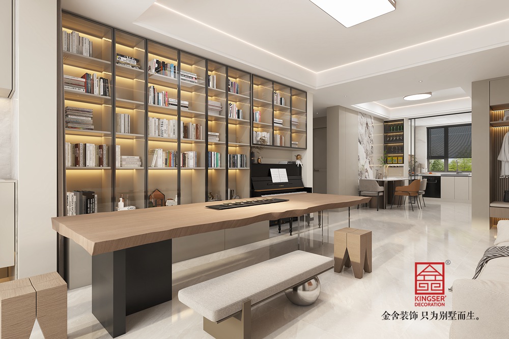 此空間采用去客廳化設計,打破傳統客廳單一社交功能的局限,打造出集閱讀、藝術、休閑等多元體驗于一體的復合區域。 整面玻璃書柜兼具收納與展示功能,暖光加持下,書籍仿若藝術品,營造出靜謐的閱讀氛圍。原木長桌造型獨特,成為空間核心,可滿足閱讀、手工等多樣需求,搭配簡約座椅與長凳,為互動交流提供靈活場景。鋼琴的融入,為空間注入藝術氣息,讓居者能隨時沉浸于音樂世界。