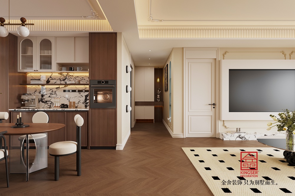 頂部獨(dú)特的串珠吊燈,造型別致,燈光透過珠串散發(fā)柔和光暈,為空間蒙上一層復(fù)古浪漫的濾鏡。背景墻的柜體設(shè)計(jì),兼具收納與展示功能,陳列的物品為空間增添了故事感與文化底蘊(yùn),整體打造出一個(gè)復(fù)古雅致且舒適宜人的中古風(fēng)客廳空間。