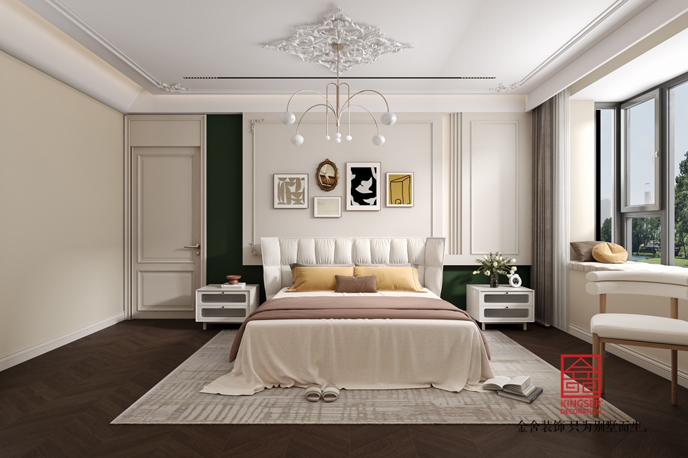 該客廳以中古風(fēng)為設(shè)計(jì)脈絡(luò),巧妙融合復(fù)古與現(xiàn)代元素。整體色調(diào)溫暖柔和,木質(zhì)地板與淺米色墻面相襯,營造出靜謐舒適的基底氛圍。 墨綠色絲絨沙發(fā),憑借其復(fù)古的紋理與飽滿的造型,成為空間視覺重心,搭配色彩協(xié)調(diào)的抱枕,盡顯復(fù)古優(yōu)雅。兩側(cè)造型圓潤、質(zhì)感柔軟的白色單人椅,為空間注入靈動(dòng)與溫馨感,與沙發(fā)形成有趣的風(fēng)格對話。