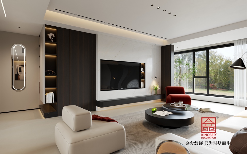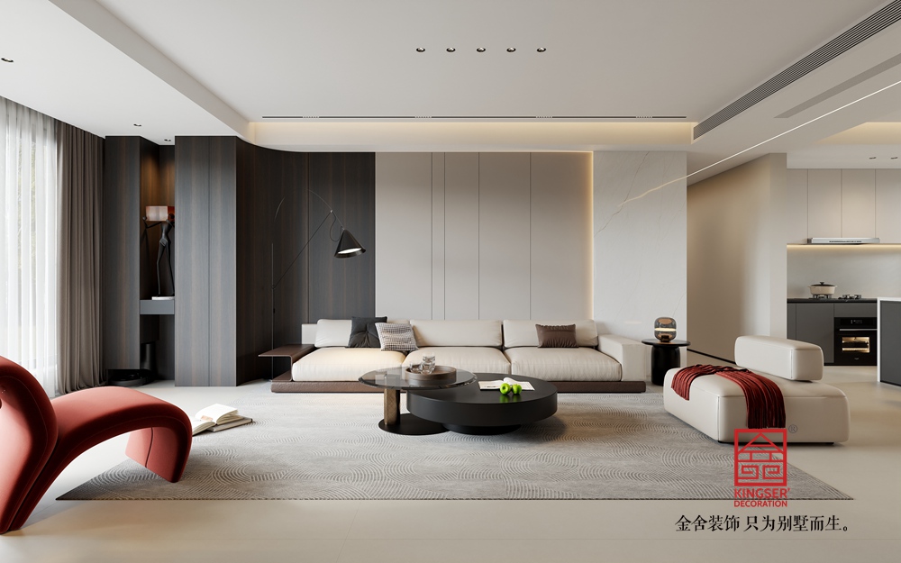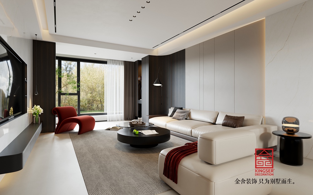 淺米色的大沙發,搭配色彩層次豐富的抱枕,為休憩提供舒適且具美感的載體。黑色圓形組合茶幾,造型簡約又不失設計感,與整體空間的利落線條相呼應。一旁的白色單人沙發,搭著紅色織物,既豐富了色彩層次,又增添了溫馨感,紅色異形休閑椅更是以亮眼色彩和獨特造型,成為空間的點睛之筆,注入藝術活力。