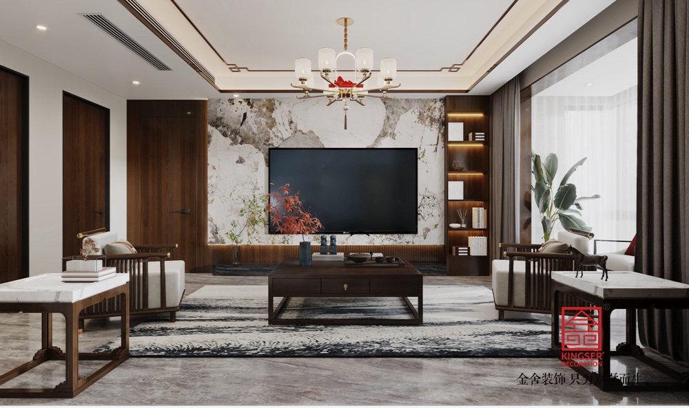 家具造型汲取中式傳統形制精髓,線條簡潔流暢,實木框架搭配軟包,既保留古樸韻味,又具現代舒適感。墻面的山水紋理裝飾、精致的中式吊燈,以及茶幾上的瓷器擺件,處處彰顯中式美學的雅致。