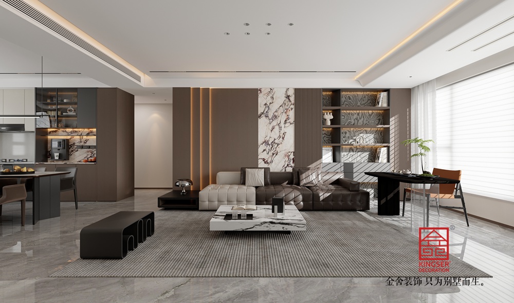 地面選用質(zhì)感細(xì)膩的灰色大理石瓷磚,通過天然紋理提升空間高級(jí)感;沙發(fā)組合融合皮質(zhì)與布藝材質(zhì),在觸感與視覺上形成層次;背景墻結(jié)合大理石飾面板與金屬線條,金屬的精致光澤與石材的天然肌理碰撞,凸顯輕奢質(zhì)感。