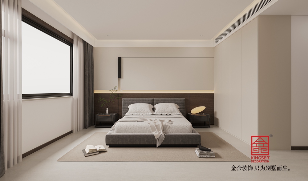 采用開放式布局,將觀影、休憩功能有機整合。線性燈光設計強化了空間縱深感,隱藏式燈帶與點光源結合,營造出柔和且富有層次的照明效果;大面積落地窗搭配百葉簾,保證采光的同時兼顧隱私,讓空間在通透與雅致間找到平衡。